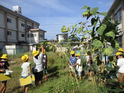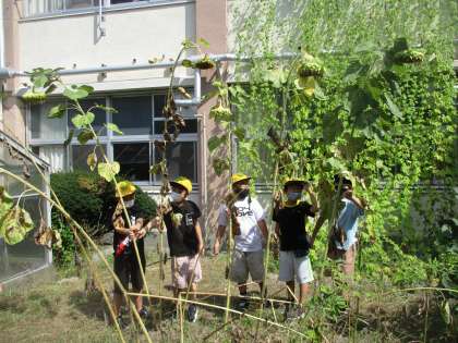 理科の時間、ヒマワリの花が咲いた後の様子を観察しました。花は枯れて下に垂れて、葉っぱも茶色くなっていました。背も比べてみました。ヒマワリの方がまだ、高いですね。