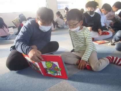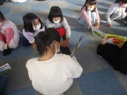 朝、6年生のお兄さんお姉さんに絵本を読んでもらいました。お話を楽しんで聞くことができました。益々、お兄さんお姉さんのことが好きになりました。