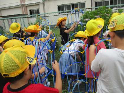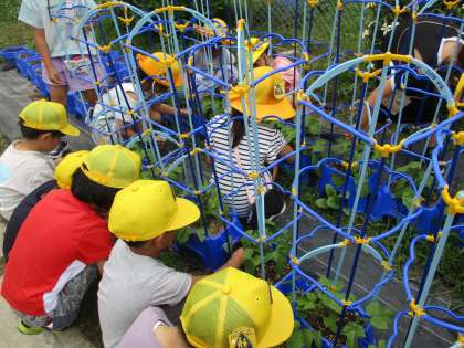 あさがおが大きく育ち、そろそろ「つる」が出てくる頃です。今日は支柱を立て、追肥をまきました。きれいな花が咲くのを子供たちはとても楽しみにして、毎朝、水やりに励んでいます。