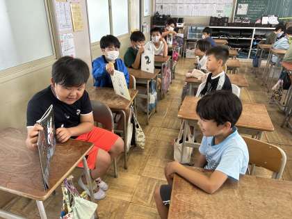 今日は朝学習の時間に5年生さんに本の読み聞かせをしてもらいました。5年生のお兄さん・お姉さんは読み聞かせがとても上手で、みんなとても楽しそうに読み聞かせを聞いていました。