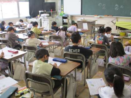 1年生の国語の授業です。ひらがなの学習です。書き順やそのひらがなが、はいることばを学びました。