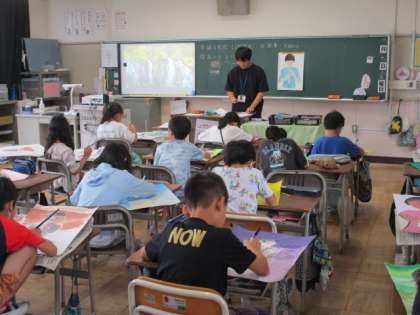 3年生の図工です。楽器を吹く自分の姿を表現しました。まもなく完成です。