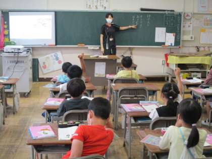国語の授業です。「いちばんおどろいたくちばしはどれですか」というめあてについて、わけといっしょに話しました。