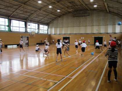 体育の授業です。ソフトミニバレーのボールを使ってパスの練習をしました。