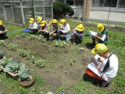 梅雨に入り雨が多く、気温も高くなってきて、植物がどんどんと成長しています。植物の高さや葉の形・色など以前に観察したときとくらべて、どのように変わっているかに気をつけながら観察記録をかきました。