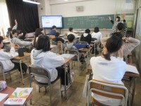 国語、算数、家庭の授業です。3枚目の家庭のナップザックづくりでは、布にしるしをつけてわきを縫う準備をしました。