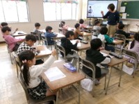 国語、体育、書写の授業です。映像資料を参考にして、クイズゲームのやり方を確かめま...