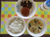 今日の献立は、ごはん、牛乳、絹厚揚げの肉みそがけ、こまつなのおひたし、みぞれ汁...