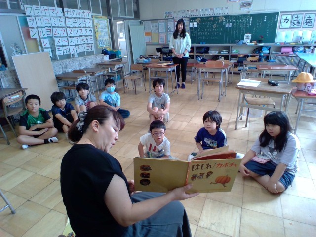 明日から10月ということで、かぼちゃのお話を読んでいただきました。10月、ハロウイーンが楽しみですね。