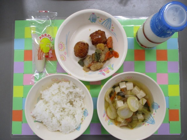 今年の十五夜は10月6日です。「いも名月」とも呼ばれる十五夜にちなんで、給食ではさといもをとり肉や栗などと煮ました。また、十五夜汁にはうさぎの形のかまぼこが入り、さといもの形をした月見団子もつけました。秋の行事食を楽しみましょう。