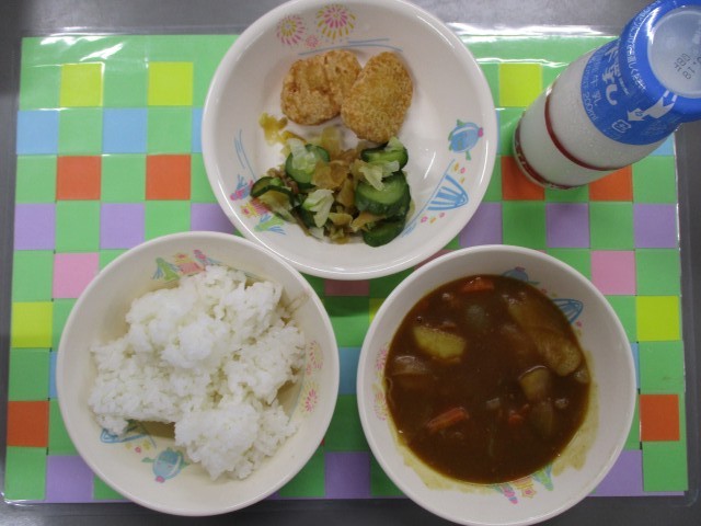 今日の献立は、ごはん、牛乳、ポークカレー、チキンナゲット2個、福神漬和えでした。