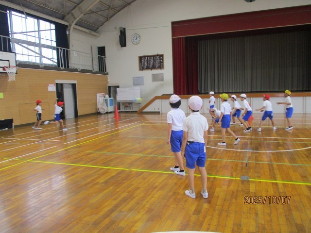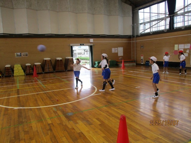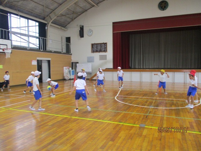 途中で雨が降ってきたので、体育館でドッジボールを行いました。