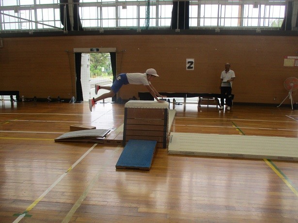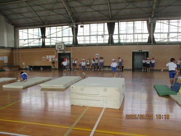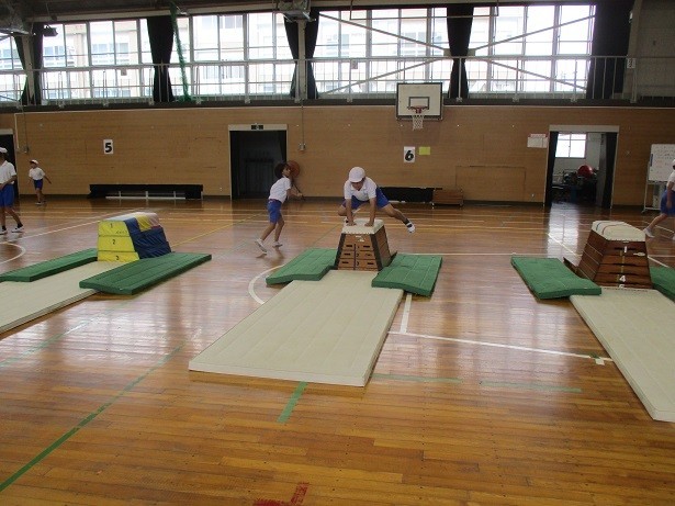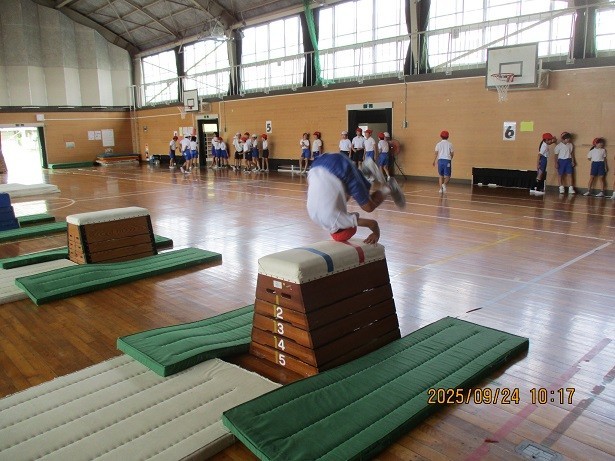 体育のとびばこ運動では、いろいろな跳び方に合わせた場所を用意して、それぞれの跳び方に向けて練習しました。開脚飛び、閉脚跳び、台上前転などの練習をしました。