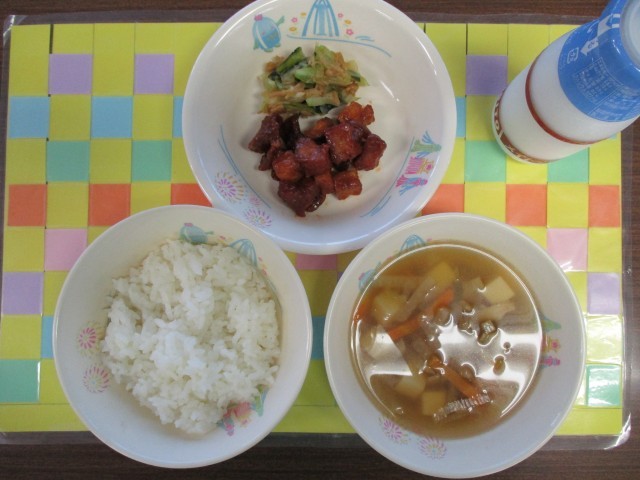 今日の献立は、ごはん、牛乳、かつおのあけぼの和え、キャベツのなめたけ和え、秋の香り汁でした。