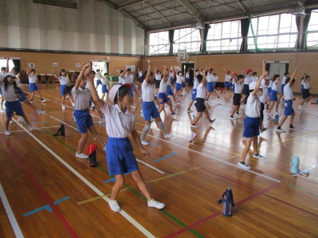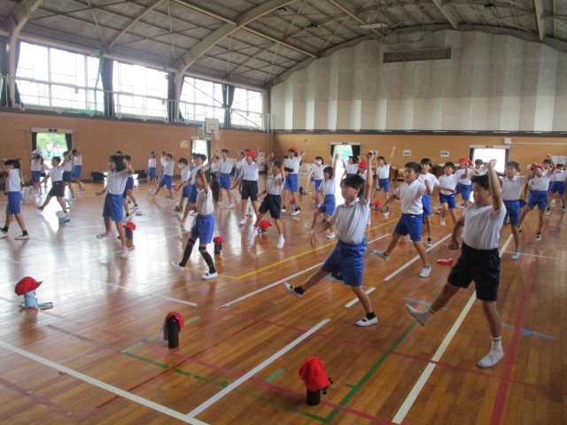 今日から運動会の練習が始まりました。これまで「やってみよう」は練習していましたが、学年で「ソーラン節」を練習するのは今日からです。運動会の表現についての心構えを聞いた後、「やってみよう」を踊って体を温め、「ソーラン節」の練習に入りました。