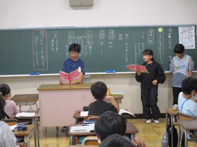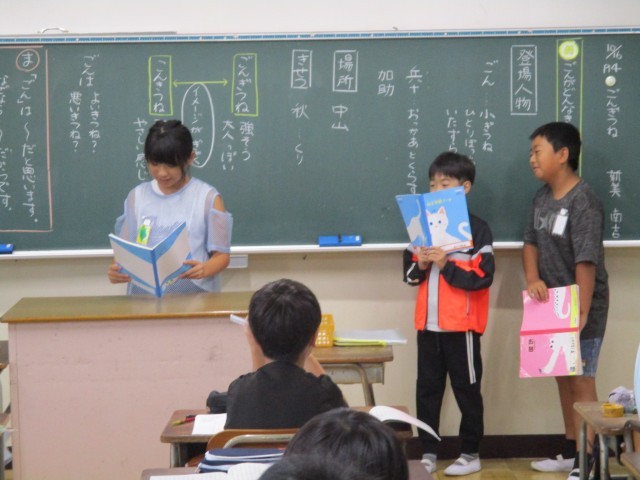 国語の授業で「ごんぎつね」の学習をしています。今日は「ごんは、よいきつねか、悪いきつねか」をみんなで話し合いました。話し合いの後で班の代表の児童が自分の考えをクラスみんなに伝えました。自分とは違う考えを聞いて学びを深めることができましたね。