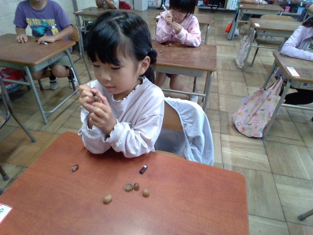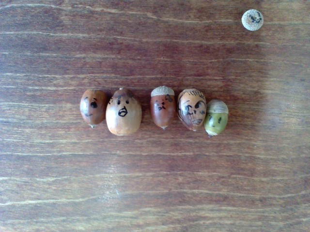 生活の授業で、秋の木の実で遊びました。お気に入りの木の実を5個拾ってきて、絵を描いて遊びました。かわいいどんぐりがたくさん完成しました。