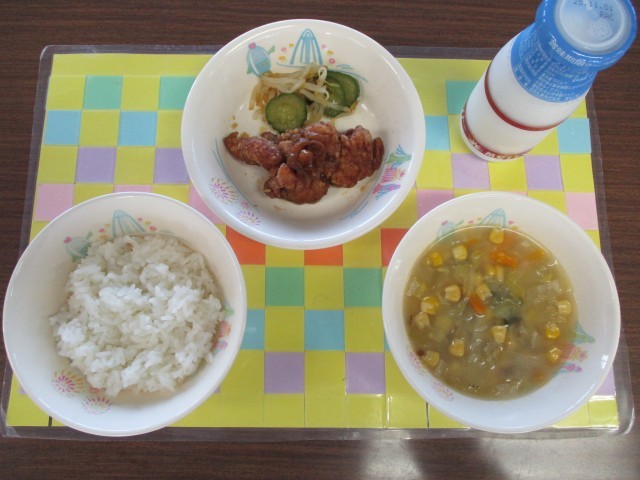 今日の献立は、ごはん、牛乳、ユーリンチー、もやしの中華和え、中華コーンスープでした。