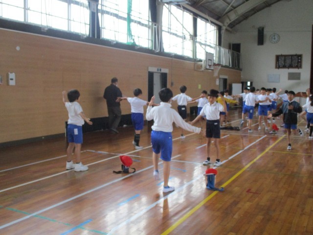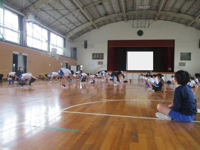 今日も練習をがんばっています。ソーラン節の練習は今日で4回目です。振りを覚えた子は後ろを向いて、動画を見なくても踊れるか確かめたり、クラスごとに互いの動きを見合っていいところを見つけたりしました。