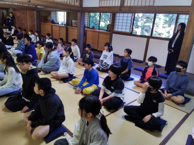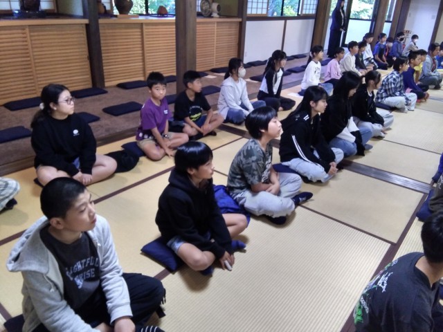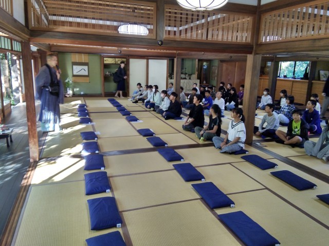 座禅体験の前にお坊さんのありがたいお話を聞いています