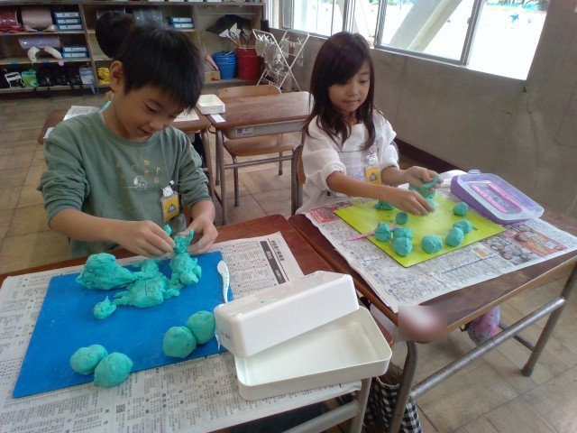 立体的に立つように作るのは、なかなか大変ですが、上手な子の作る様子を見ながら、人を立たせる事ができました。