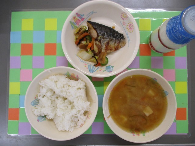 今日の献立は、ごはん、牛乳、はまちの照り焼き、つぼ漬け和え、さつまいものみそ汁でした。