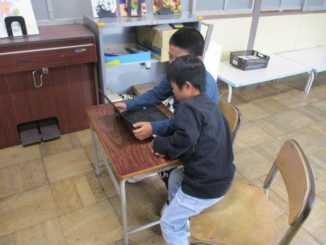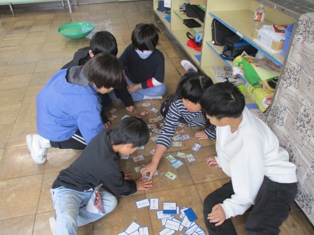 みんなでかるたで遊びました。男女も学年も関係なく、仲良く過ごせています。うまく取れた子をほめたり、困ったことには自分たちで話し合ってルールを決めたりしながら、楽しく遊ぶことができました。また、1つのchromebookの画面を2人で仲良く見ることができている子たちもいました。