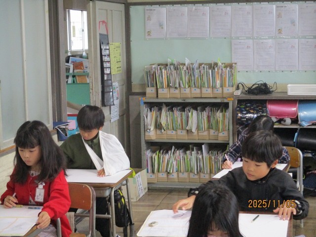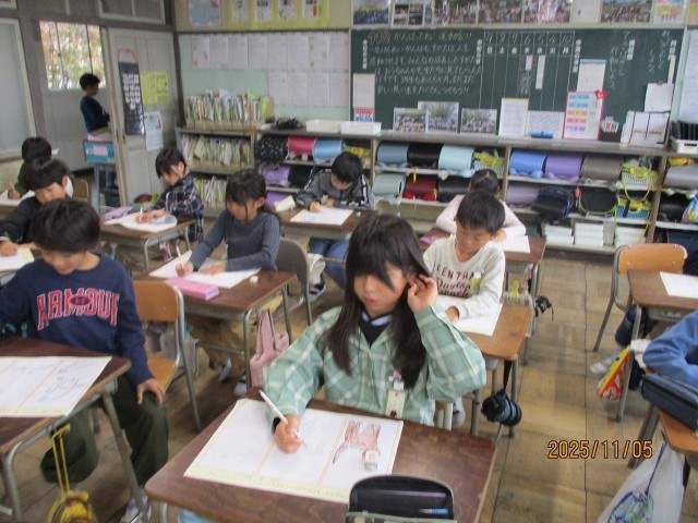 物語を聞いて、想像しながら絵を描いています。表情や顔つき、周りの物などを考えながら下書きを完成させました。