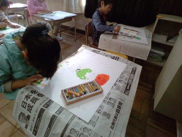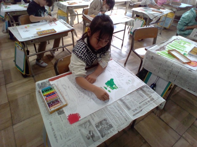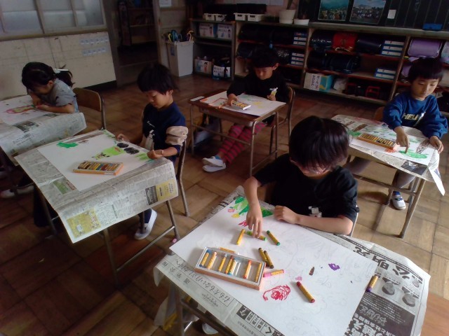 図工の授業で、読書感想画を描いています。今日は、クレヨンを使って色を塗りました。次回は、絵の具を使っていきます。完成が楽しみです。