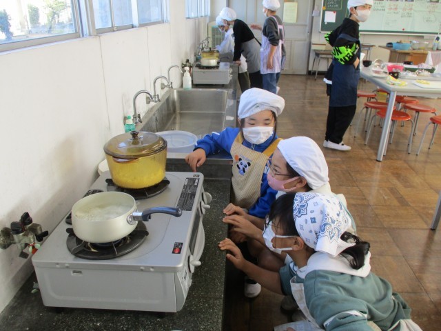 家庭科の時間にご飯とお味噌汁を作りました。準備、調理、片付けまでグループで分担して取り組んでいました。完成するととても嬉しそうにしていました。