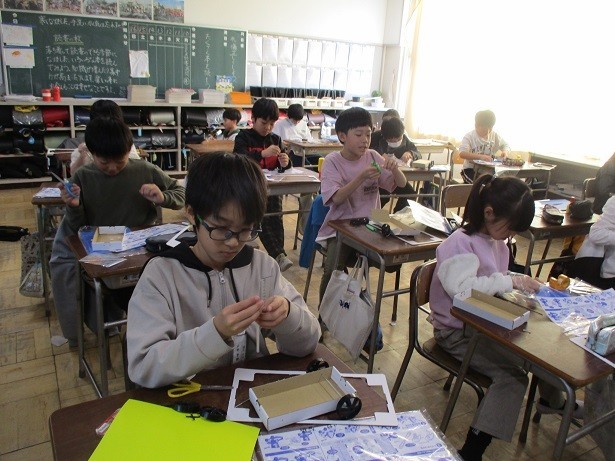 図工では、ゴムの力で動く仕組みを使って車を作ります。今日はその第一時間目です。完成が楽しみです。