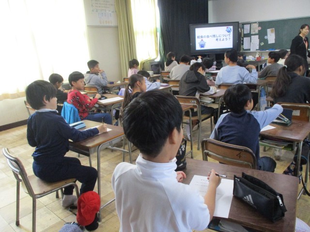 栄養教諭から食育指導がありました。給食にどれくらいの量の食材が使われているか、そして、どれくらいの量の残食があるかを動画で学習しました。また、残食の処理にもお金や手間がかかることなどを知り、これからの自分にできることを考えました。