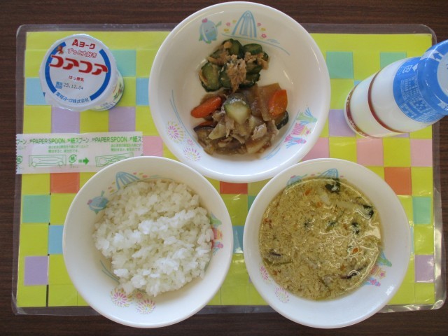 今日の献立は、ごはん、牛乳、梅味ぶたこまだいこん、きゅうりのツナ和え、かきたま汁、ヨーグルトでした。