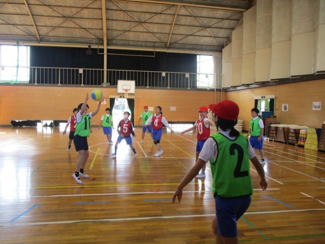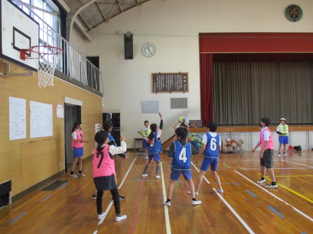 体育では、バスケットボールを行っています。ルールを理解してチームで声をかけあって試合をしていました。
