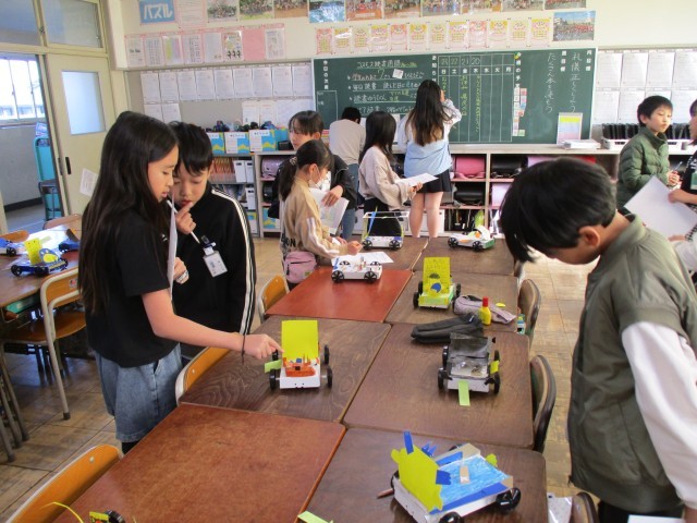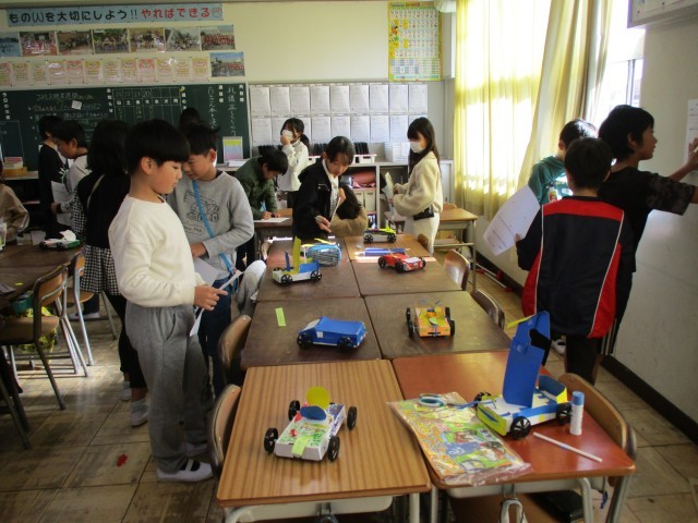 図工「ゴムでゴー!ゴー!ゆめの乗り物」で鑑賞会をしました。自分の作品の工夫した点、こだわった点を振り返りカードに記入したあとで、友達の作品を鑑賞しました。作品の工夫や、すてきなところを見つけ伝え合うことができました。