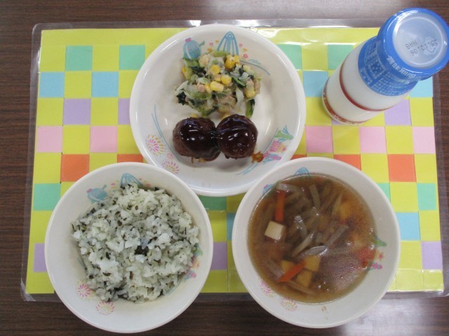 今日の献立は、わかめごはん、牛乳、肉団子2個、塩だれサラダ、けんちん汁でした。