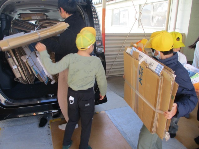 学校で出た古紙をリサイクルするために、地域の回収場所へ運びました。教室に戻った後、リサイクルされる動画を見て、資源を大切にしていきたいという気持ちが高まったようでした。