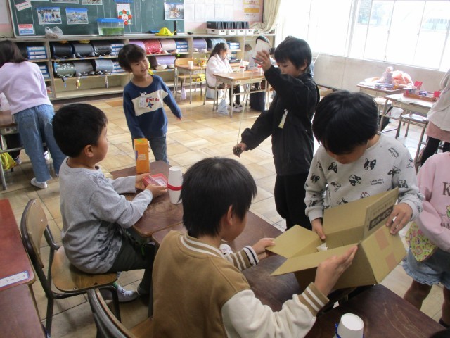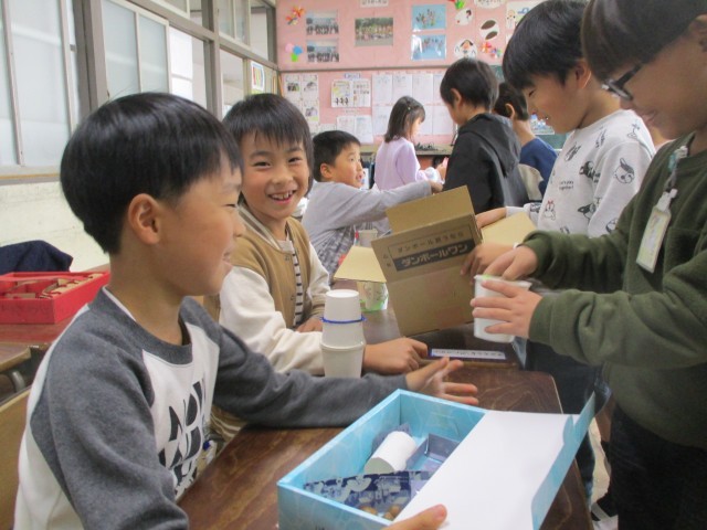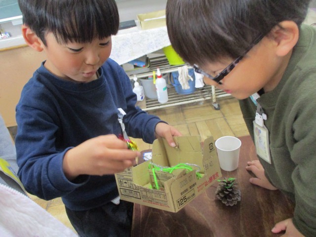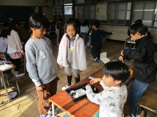 生活科の時間、これまでに作った、校庭で見つけたどんぐりや、松ぼっくりを使って作ったおもちゃで遊びました。「自分の作ったおもちゃで楽しそうに遊んでくれた」と喜んでいる子や、友達の作ったどんぐり迷路のおもしろい工夫を紹介してくれる子、「次は僕ももっとすごいのを作りたい」と言っている子、みんな楽しそうでした。