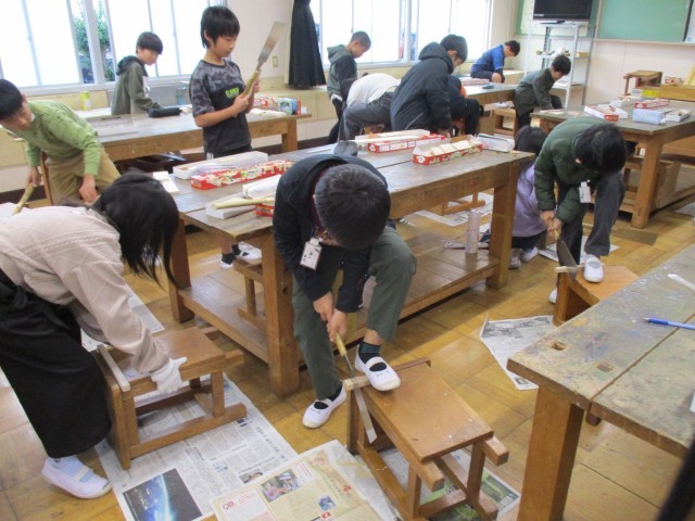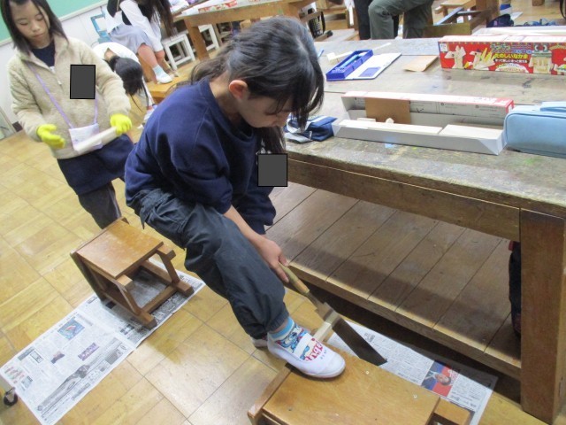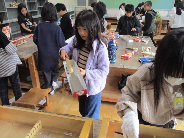 図工「ぎこぎこトントン」の学習でのこぎりの使い方を学習しました。初めはドキドキしながら作業をしていましたが、だんだん使い方に慣れ、上手に木材が切れるようになりました。のこぎりも箱に入れて運び、安全に片付けることができました。