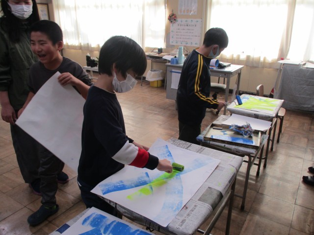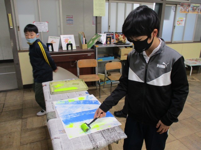 教育展に向けてシール版画の制作に取り掛かっています。今日はローラーでインクを付けました。段ボールや丸めた紙で模様を付けて工夫する子もいました。乾いたらシールを貼って、またインクを付けます。どんな作品になるか楽しみですね。