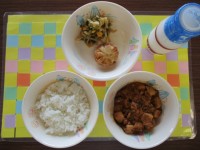 今日の献立は、ソフトめん、牛乳、ソフトめんミートソース(汁)、ボロニアステーキ、ほうれんそうのサラダでした。