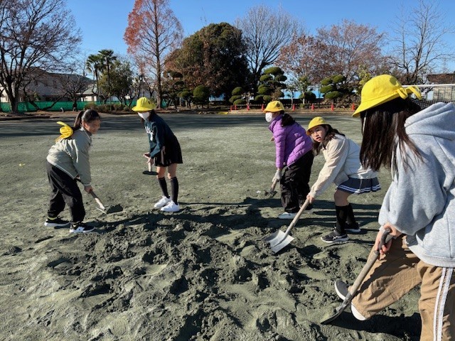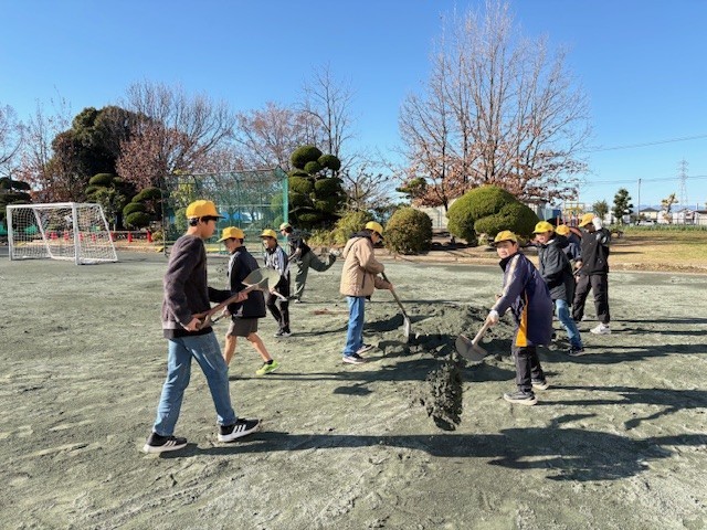 山盛りになっているグラウンドの砂をシャベルを使って広げてくれました。