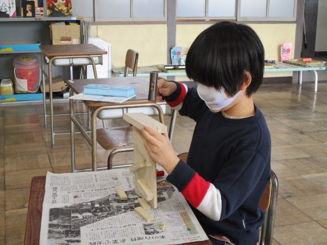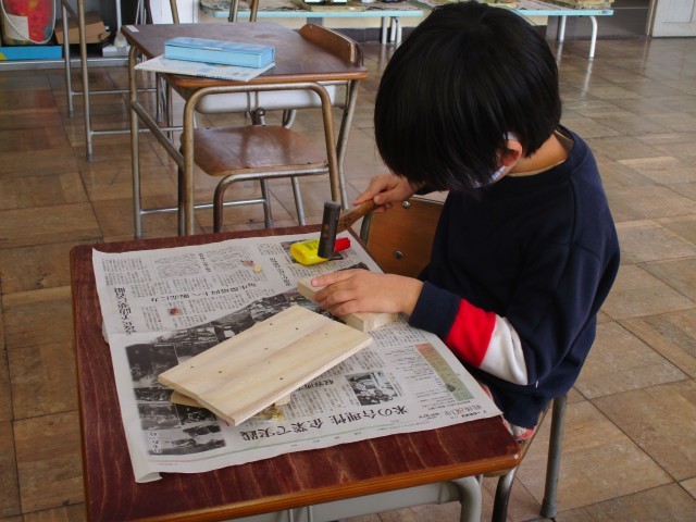 「ギコギココロコロ」という教材でのこぎりと金づちを使って作品を仕上げています。