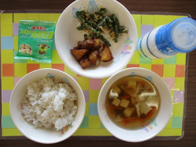今日の献立は、麦ごはん、牛乳、あんこうとじゃがいもの甘がらめ、いんげんのごまささみ和え、すまし汁、味付乾燥豆腐でした。