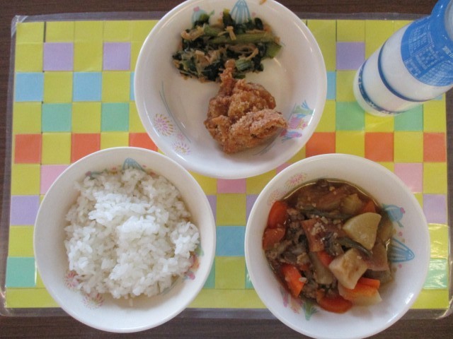 今日の献立は、ごはん、牛乳、とり肉の竜田揚げ、だいこんのそぼろ煮、こまつなのなめたけ和えでした。