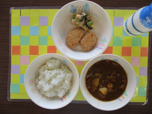 今日の献立は、ごはん、牛乳、ポークカレー、チキンナゲット2個、まめまめサラダでした。