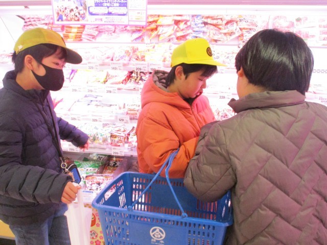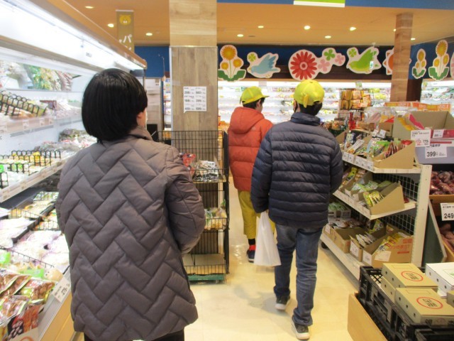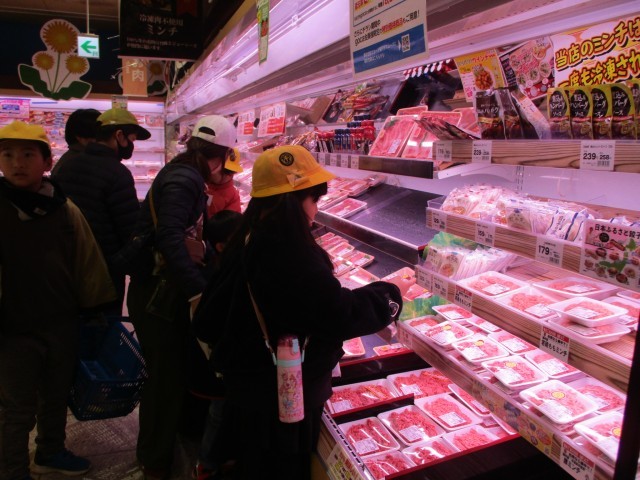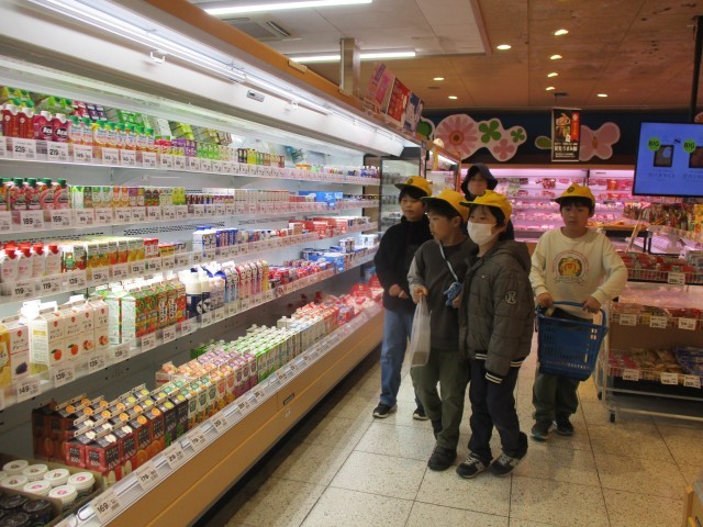 スーパーマーケットでは、学年ごとにグループになって担当の食材を探しに行きました。消費期限を見たり、似た商品の値段を比べたりして選びました。