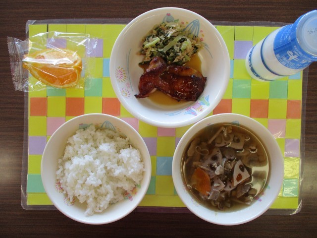 今日の献立は、ごはん、牛乳、てりどり、しゅんぎくのツナ和え、冬の根菜汁、しらぬいでした。