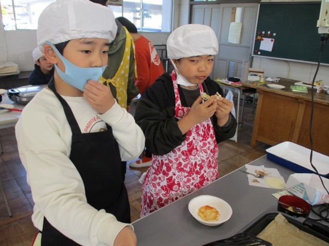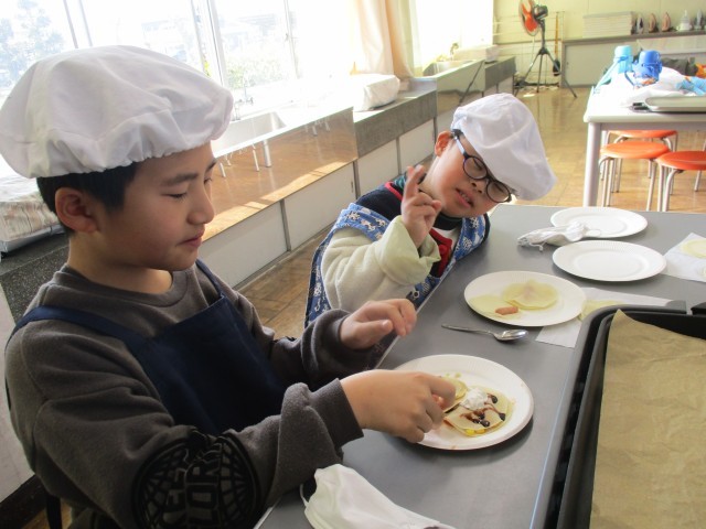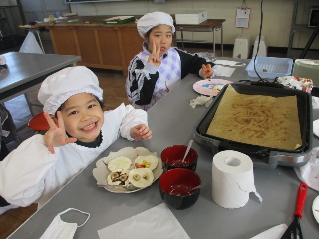 ピザが焼けました。おいしくいただいています。4年生と6年生は、ピザを食べている時間に次のピザをホットプレートに手際よく載せて、効率よく焼けるように工夫していました。