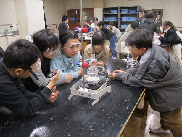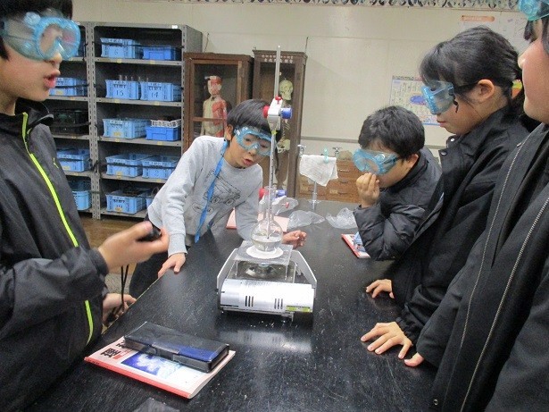 水を熱し続けると、どうなるかを予想して、調べました。ある温度のあたりで温度変化が止まることに気づきました。
